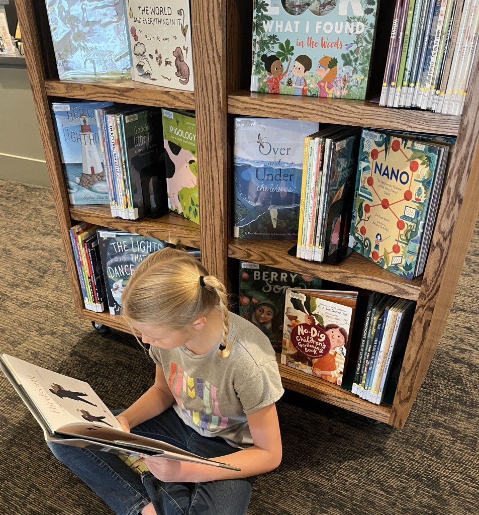 Featured book is Birdsong by Julie Flett. The books on the shelves are selections from The Children’s Book Project grant.